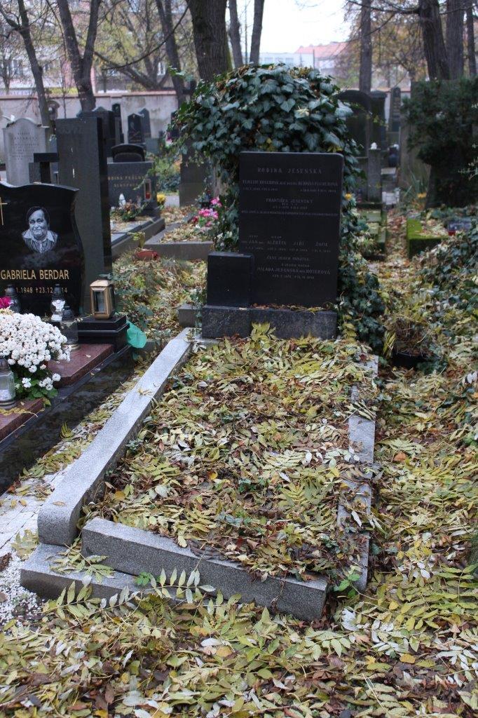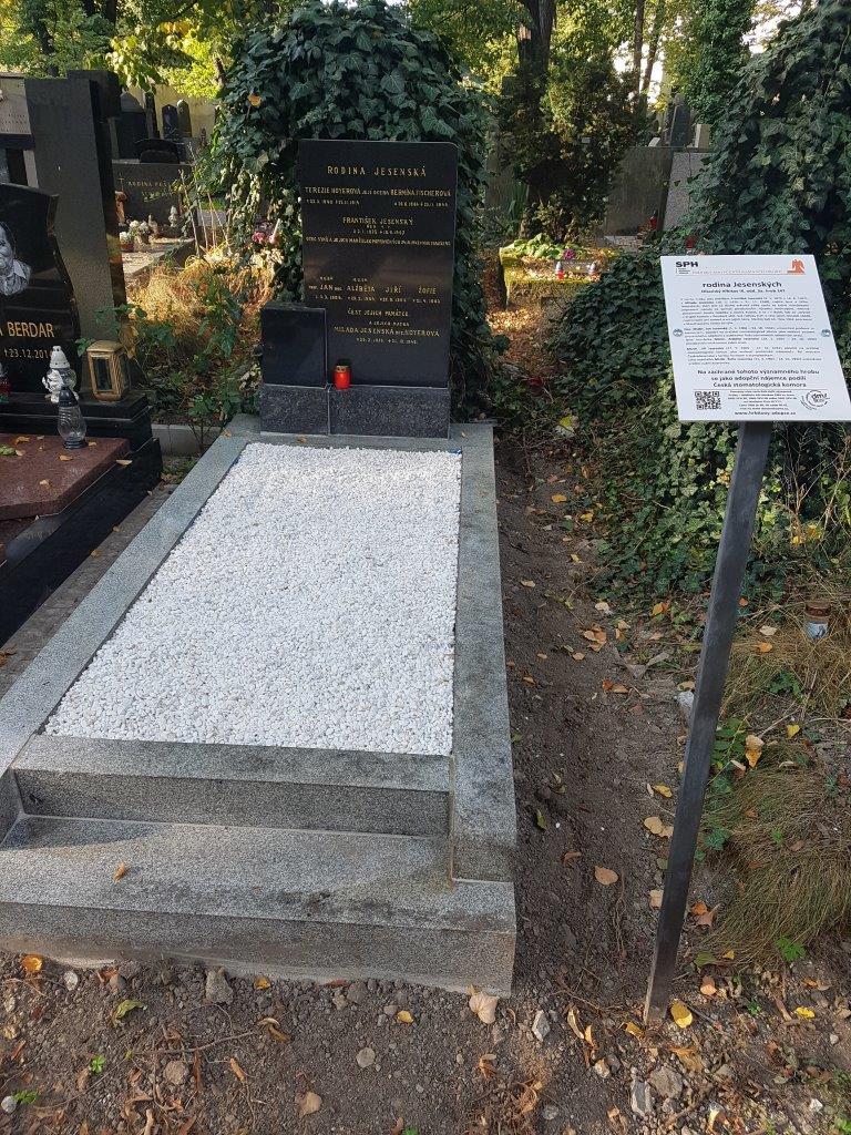 V tomto hrobu jsou pohřbeni František Jesenský (3. 1. 1875 – 16. 6. 1947) a Milada Jesenská (29. 2. 1876 – 31. 12. 1948), rodiče Jana a Jiřího Jesenských, kteří byli za druhé světové války spolu se svými manželkami popraveni nacisty za pomoc parašutistům ze skupiny Anthropoid. Aktivně podporovali Josefa Gabčíka a Josefa Kubiše, a to i v době, kdy se ukrývali v kryptě kostela v Resslově ulici. Své rodiče, kteří o této činnosti věděli, neprozradili při výsleších ani synové, ani jejich manželky. Všichni čtyři byli 24. října 1942 popraveni v Mauthausenu ranou do týla. Doc. MUDr. Jan Jesenský (5. 3. 1904 – 24. 10. 1942), univerzitní profesor in memoriam, působil na pražské stomatologické klinice jako vedoucí asistent protetického oddělení a publikoval řadu významných odborných prací. Jeho manželka MUDr. Alžběta Jesenská (29. 2. 1904 – 24. 10. 1942) provozovala soukromou zubní praxi. MUDr. Jiří Jesenský (27. 9. 1905 – 24. 10. 1942) působil na pražské stomatologické klinice jako vedoucí protetické laboratoře. Byl mistrem Československa v šermu fleretem a olympionikem. Jeho manželka MUDr. Žofie Jesenská (21. 4. 1903 – 24. 10. 1942) pracovala jako zubní asistentka.