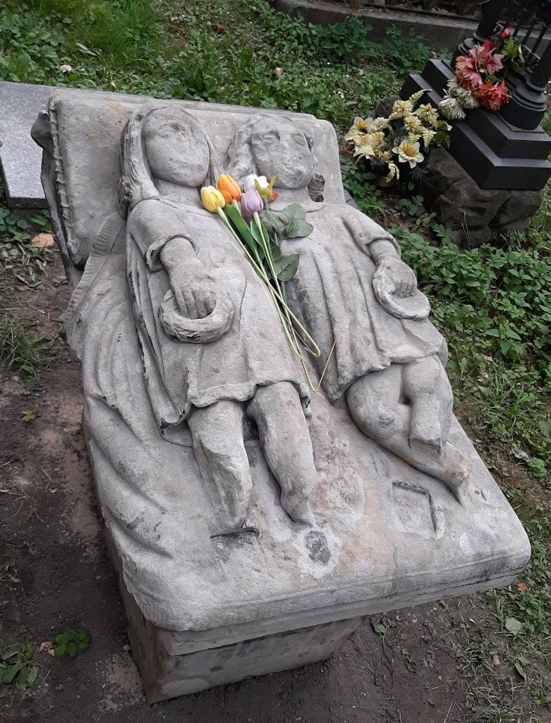 Jeden z nejznámějších Olšanských náhrobků připomíná dvě sestry, Františku a Antonii, které zahynuly tragickou smrtí, kdy jim podle legendy těžký povoz přejel nohy a obě děvčátka vzápětí na místě zahynula. Původně byl umístěn na zrušeném I. Olšanském hřbitově v místech, kde se dnes nachází parčík okolo kostela sv. Rocha. Nápisová deska se dodnes nachází na vnější zdi hřbitova, zhruba ve stejné vzdálenosti od vchodu, v jaké je dnes umístěn samotný přenesený náhrobek. Už počátkem 19. století se náhrobek a smutný osud děvčátek stal, právě tak jako Svatá holčička na Malostranském hřbitově natolik známým, že byl a dodnes je hojně navštěvován a vždy ozdoben záplavou květů. Snad jen díky této legendě a oblibě mezi pražany tak nedošlo ke zničení náhrobku při zrušení hřbitova a na rozdíl od velké řady náhrobků významných osobností, pohřbených na I. hřbitově byl tento přenesen na své nynější místo. Nápisová deska ve zdi hřbitova je často v literatuře zmiňována jako nejstarší deska s českým textem na tomto hřbitově. Dnes už takřka nečitelný nápis zní: Zde 2 sestri spolu spime Klenkowi sme zplozeni že nas anděl sbudi wime genž w Kristu sme zrozeni. Kterikolif tudi pugdeš rozwaš svoge pohodli tie žadame diš to přečteš tak se za nas pomodli. Dále deska pokračuje tímto textem: Zde w Panu odpožwa panna Antonia Klenkova gegi staři 28 led Odebrala se na řečnost 6 teho marzi 1805 i tež zde w Panu odpožea panni Františka De Pauli Ziskowa piwni nakladnice Noweho Mniesta Praskeho gegi staři 26 let zesnula 8. ledna 1806. Překlad úvodního odstavce zní: Zde dvě sestry spolu spíme, Klenkovy jsme zplozeny, že nás anděl vzbudí víme, neb jsme v Kristu zrozeny. Kterýkoli tudy půjdeš, rozvaž svoje pohodlí, tě žádáme, když to přečteš, tak se za nás pomodli.