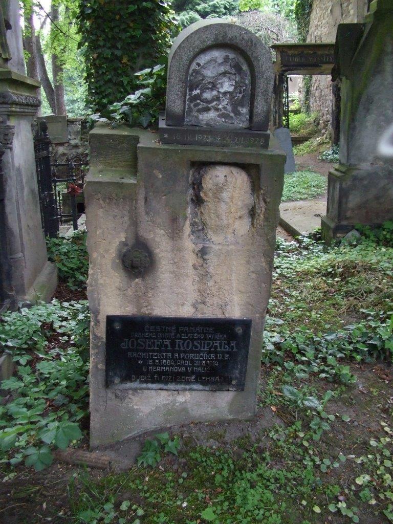 Josef Rosipal (18. 5. 1884 – 31. 8. 1914) byl architekt a sklářský návrhář. Narodil se v Praze. V letech 1903 až 1904 a 1908 studoval architekturu na pražské Technice, poté pracoval jako inženýr na stavbě dráhy v Ražicích u Písku a pro magistrát hlavního města Prahy. V období let 1910 až 1914 se zabýval také návrhy skla pro umělecké družstvo Artěl. Jeho realizace stolního a dekorativního skla jsou dnes ve sbírkách Uměleckoprůmyslového muzea v Praze a muzea MAK ve Vídni. Jeho nejznámější architektonickou prací je projekt Městského sirotčince v Praze na Hradčanech (dnešní Ministerstvo kultury), dokončený roku 1911 a slavnostně otevřený roku 1913. Jedná se zřejmě o první pražskou stavbu s plochou střechou. Pro přestavbu budovy cukrárny Myšák ve Vodičkově ulici v Praze spolupracoval v roce 1910 na návrhu nových moderních výkladců. Se začátkem první světové války musel i tento mladý a nadějný architekt narukovat do armády. Bohužel velmi záhy padl v bitvě u Hermanova v Haliči, kde je i pohřben. Pamětní deska je tak umístěna na hrobu jeho manželky.