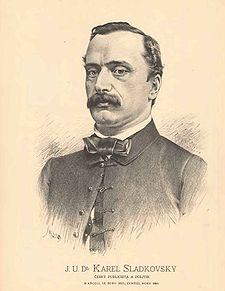 Karel Sladkovský (22. 6. 1823 – 4. 3. 1880) byl novinář, právník a politik. Narodil se v Praze v rodině krejčího. Vystudoval nejprve Malostranské gymnázium, poté se rozhodl ke studiu práv. Od roku 1845 se stal studentem práv na Vídeňské univezitě. Praxi na tamní finanční prokuratuře už ale nenastoupil a vrátil se do Prahy. Zde se stal aktivním účastníkem revolučních událostí roku 1848, kdy byl zvolen mluvčím studentů. V květnu 1849 byl zatčen a odsouzen za velezradu na dvacet let do vězení, z něhož byl po osmi letech propuštěn na amnestii se značně podlomeným zdravím. Začal pracovat jako redaktor deníku Čas a v roce 1862 po své rehabilitaci se stal poslancem Říšské rady. Stal se spoluzakladatelem a prvním předsedou Mladočechů a také výborným řečníkem a organizátorem. Byl jednou z hlavních postav českého národního obrození.